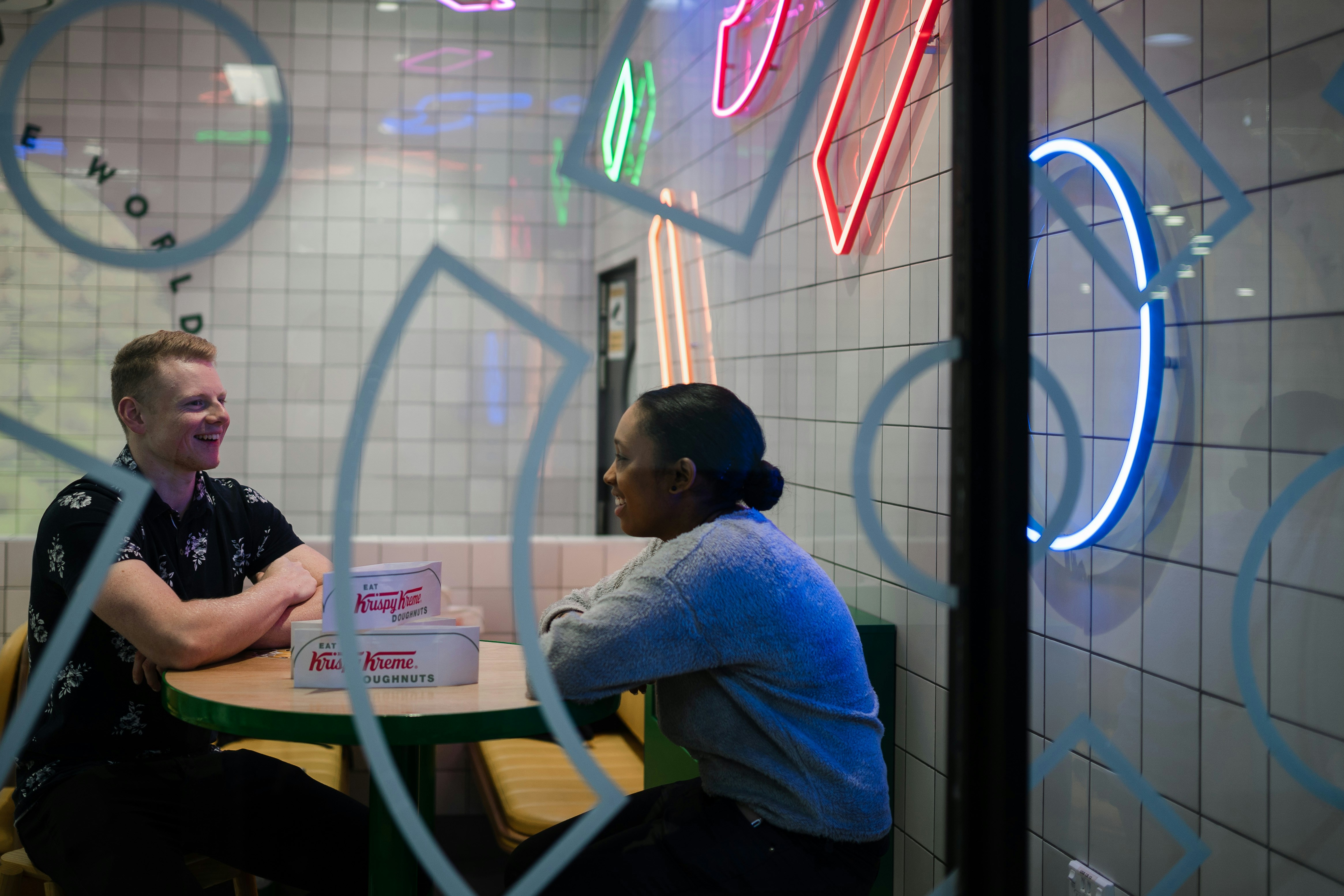 Friends having fun talking to each other under neon lights.
